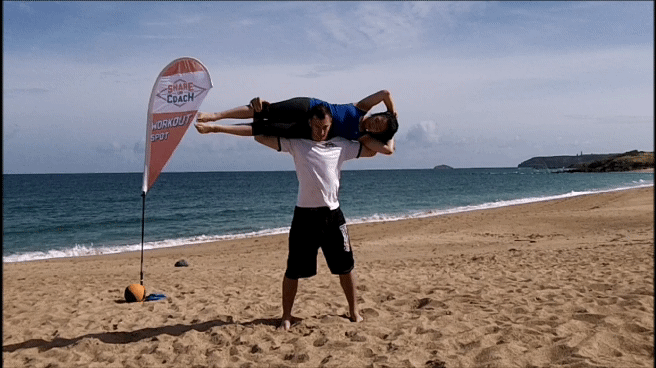 Depuis la position de Squat, porter derrière soi le/la Partner gainé(e) jusqu'à la position debout.