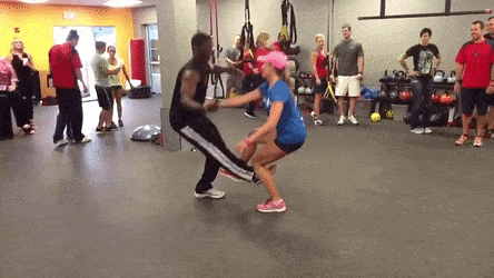 Face à face, se tenir la main, tendre la jambe du côté du bras tenu, contacter les chevilles, fléchir la jambes d'appui et remonter.