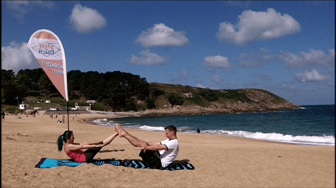 Assis face à face, contacter les plantes de pieds à hauteur de tête, garder le dos droit, tendre les bras devant et maintenir la position.