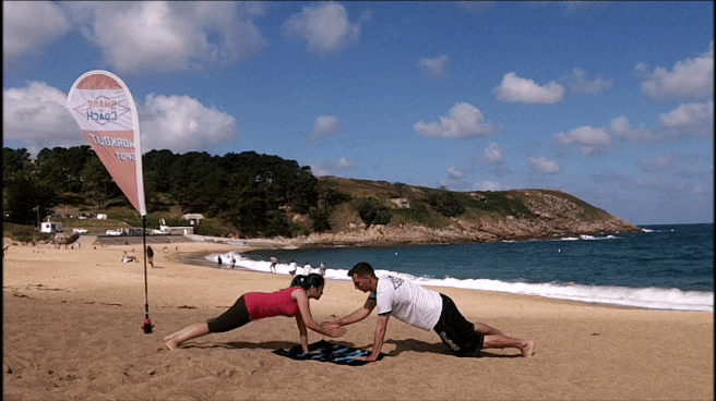 En position de planche face à face, poser les coudes puis retendre les bras pour revenir en planche classique. Taper la main du Partner pour valider la répétition.