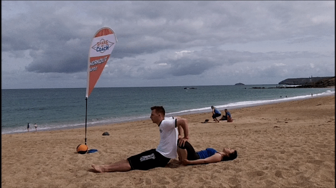 Allongé(e) sur le dos, jambes repliées, tenir ses chevilles pour plus de stabilité. Le Partner réalise des Dips en appui sur les genoux.